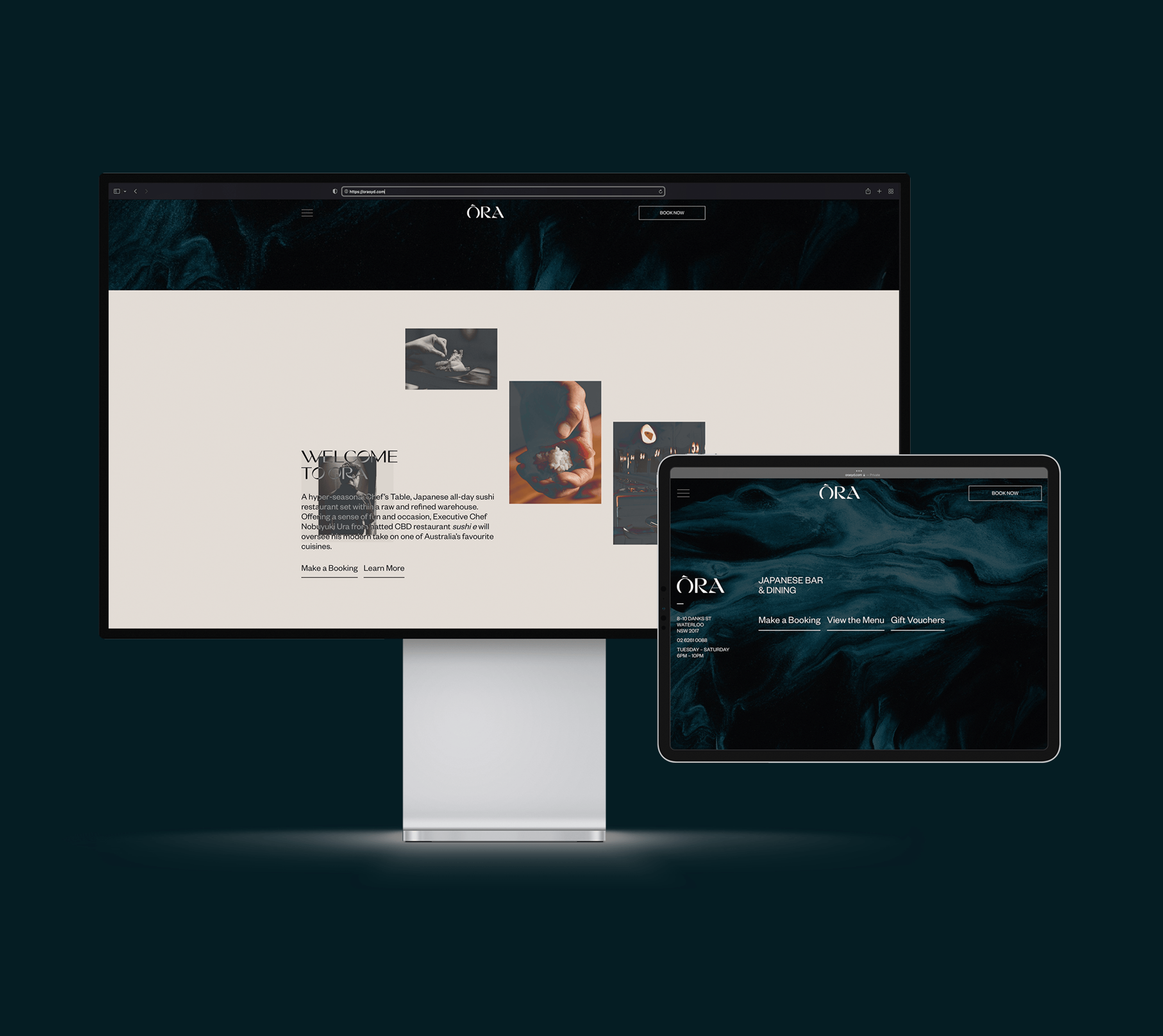 Ōra, Japanese Bar and Restaurant is headed up by executive chef Nobuyuki Ura from hatted restaurant sushi e.We were engaged to create Ōra’s brand identity from the ground up, supporting its vision of premium, hyper-seasonal dining. The identity needed to be distinctive and memorable, reflecting a menu of deceptively simple dishes defined by exceptional ingredients, precision and craftsmanship.